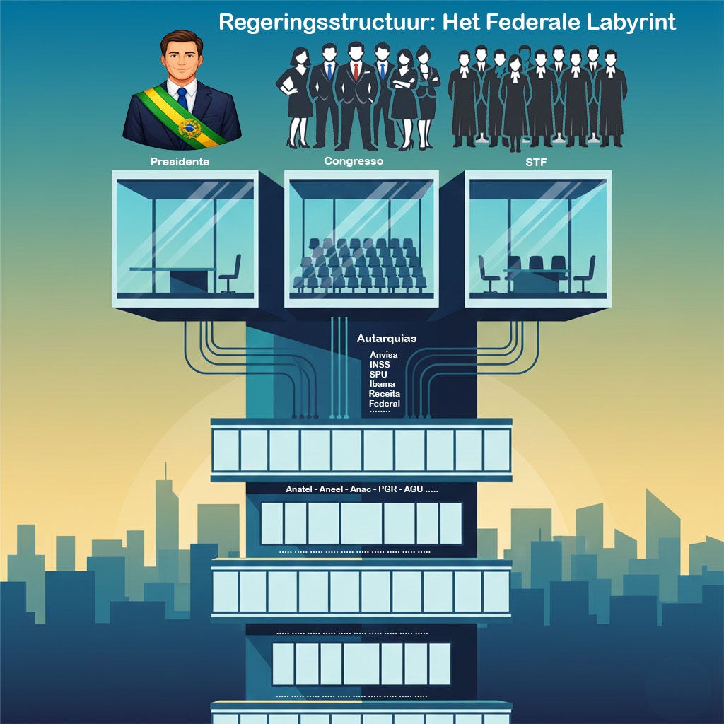 De illustratie boven deze bijdrage toont het fundament: het bestuur van Brazilië rust op de drie klassieke machten: de Uitvoerende Macht, de Wetgevende Macht en de Rechterlijke Macht. Tot zover is het overzichtelijk. Naarmate we echter afdalen in de hiërarchie, neemt de complexiteit toe.
