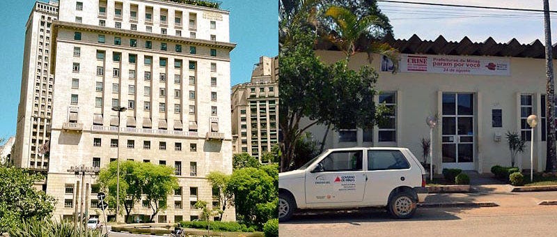 Links: De Prefeitura van São Paulo (grootste município van Brazilië met 11,9 miljoen inwoners) in het Matarazzo gebouw. Rechts: De Prefeitura van Serra da Saudade (kleinste município van Brazilië met 850 inwoners).