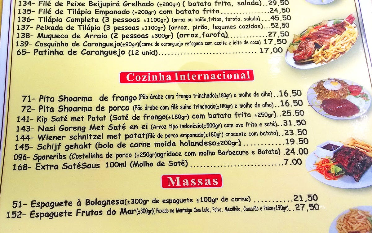 Een stukje uit een menukaart van een kiosk aan het strand van Fortaleza. De Nederlandse invloed is duidelijk aanwezig.