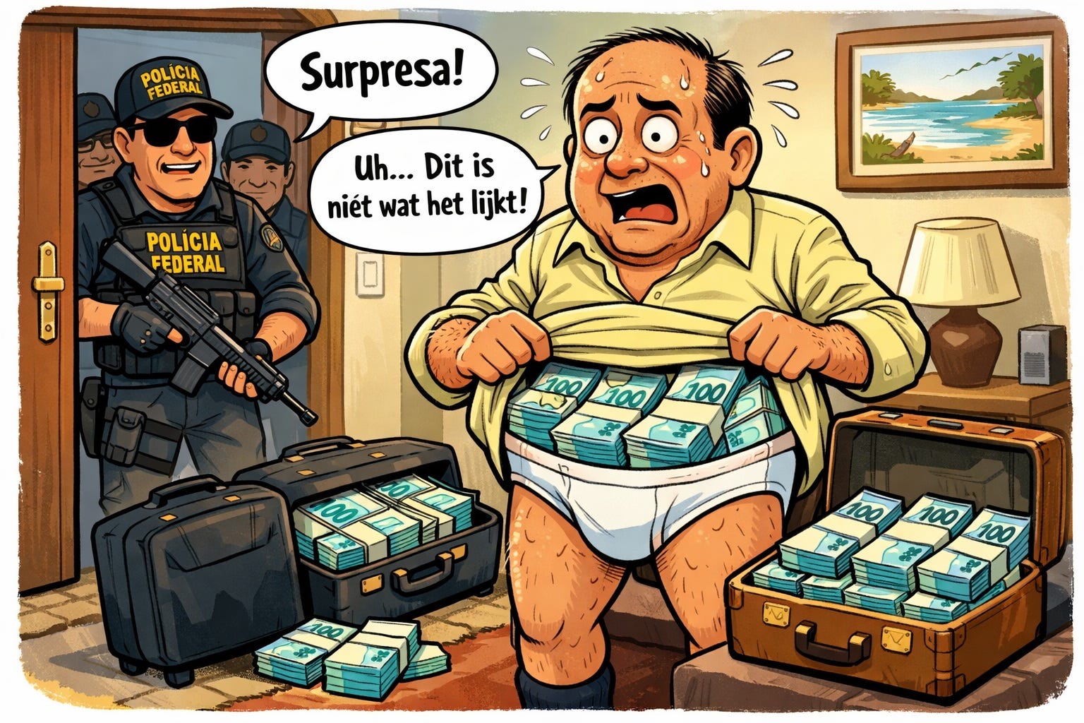 Naast de grote miljardenfraudes zijn er de incidenten die in het collectieve geheugen gegrift staan door hun bijna filmische absurditeit. Denk aan de parlementaire raadgever die op een luchthaven werd opgepakt met tienduizenden dollars verstopt in zijn onderbroek (cueca), of de schokkende ontdekking in Salvador. Daar vond de federale politie in een leeg appartement koffers en dozen gevuld met 51 miljoen reais in cash. De agenten hadden meer dan een dag nodig, enkel om het geld te tellen.