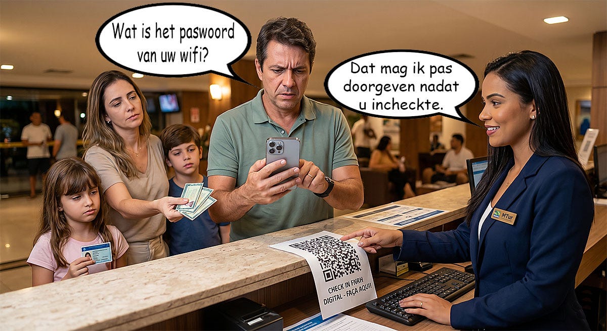 Boek je vooraf, dan stuurt het hotel (of de pousada) een link of tonen ze een QR-code. Wie een CPF heeft, kan via Gov.br inloggen, waarna alle velden (naam, adres, documenten) automatisch worden ingevuld. Gaat het om een heel gezin, dan begint de rompslomp omdat de wet een individuele registratie eist voor elke gast. Een vader die met zijn vrouw en twee kinderen aankomt na een lange reis, en niet vooraf de check-in registreert, moet nu vier digitale formulieren invullen of controleren op een klein scherm. In een land waar 4G buiten de grote steden vaak meer “G” dan “4” is, leidt dit tot haperende verbindingen en wachtrijen die langer zijn dan in het papieren tijdperk. En hoe zit het dan met niet-Brazilianen?