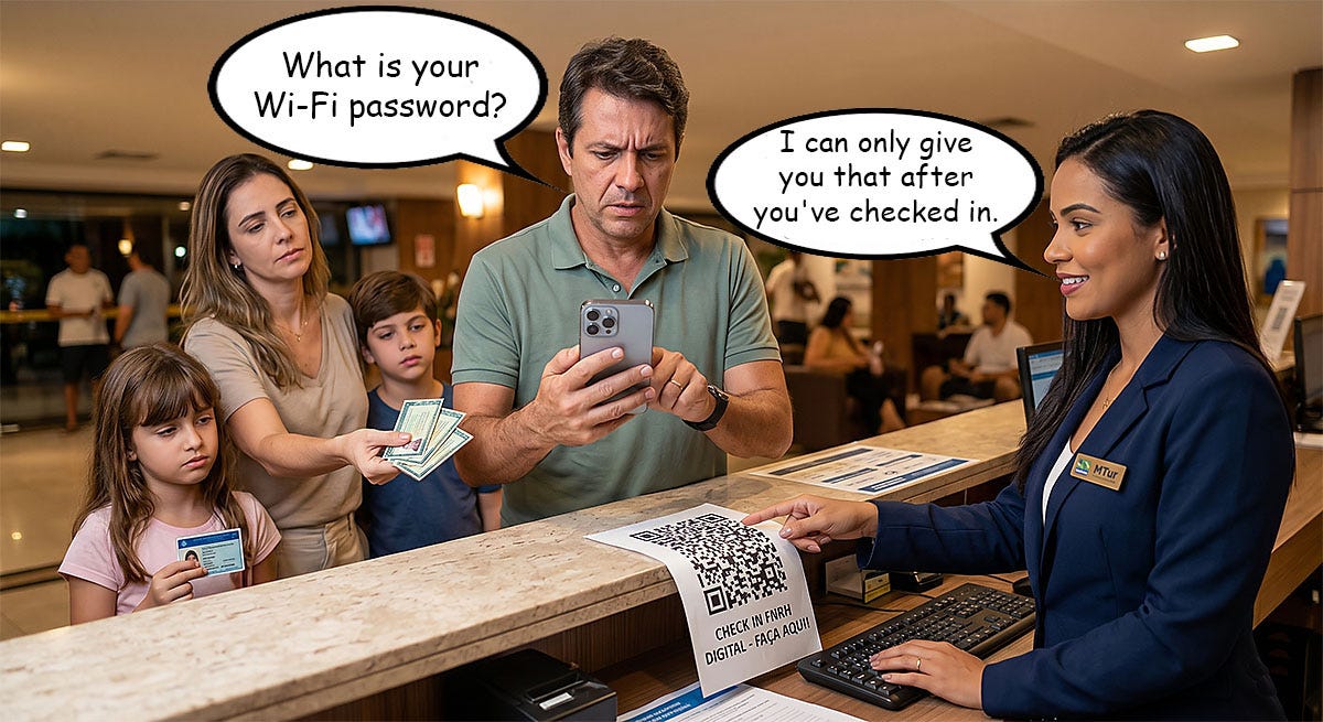 If you book in advance, the hotel (or pousada) sends a link or shows a QR code. Those who have a CPF can log in via Gov.br, after which all fields (name, address, documents) are filled in automatically. If it concerns an entire family, the hassle begins because the law demands individual registration for every guest. A father who arrives with his wife and two children after a long journey, and has not registered the check-in beforehand, must now fill in or check four digital forms on a small screen. In a country where 4G outside the big cities is often more “G” than “4,” this leads to faltering connections and queues that are longer than in the paper era. And what about non-Brazilians?