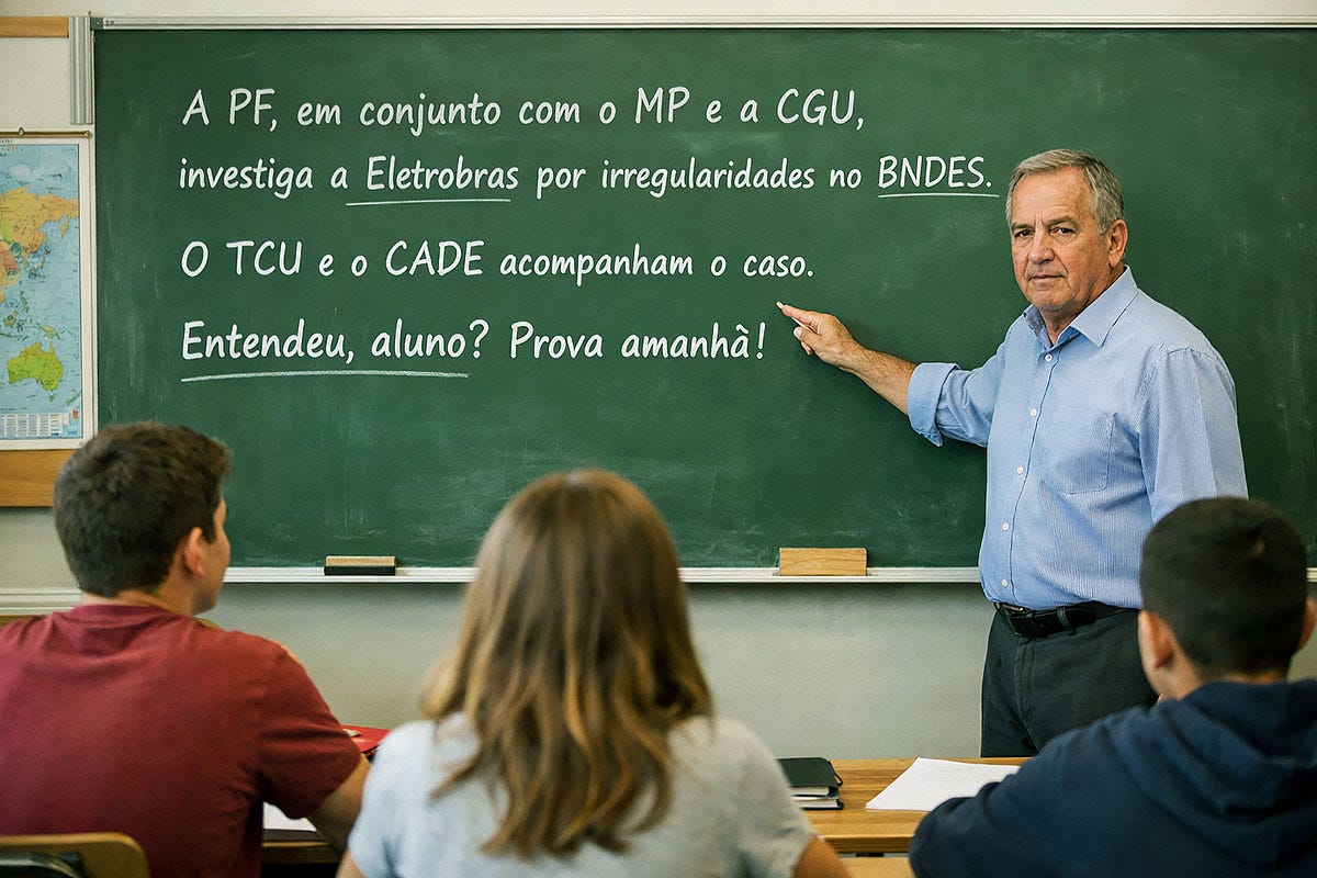 De vertaling van de (ironische) tekst op het schoolbord van de illustratie boven deze bijdrage: “De PF (Federale Politie), samen met het MP (Openbaar Ministerie) en de CGU (Algemene Controleur van de Unie), onderzoekt Eletrobras (Elektriciteitsmaatschappij) wegens onregelmatigheden bij de BNDES (Ontwikkelingsbank). Het TCU (Rekenhof) en de CADE (Antimonopolie-waakhond) volgen de zaak. Begrepen, leerling? Morgen examen!”